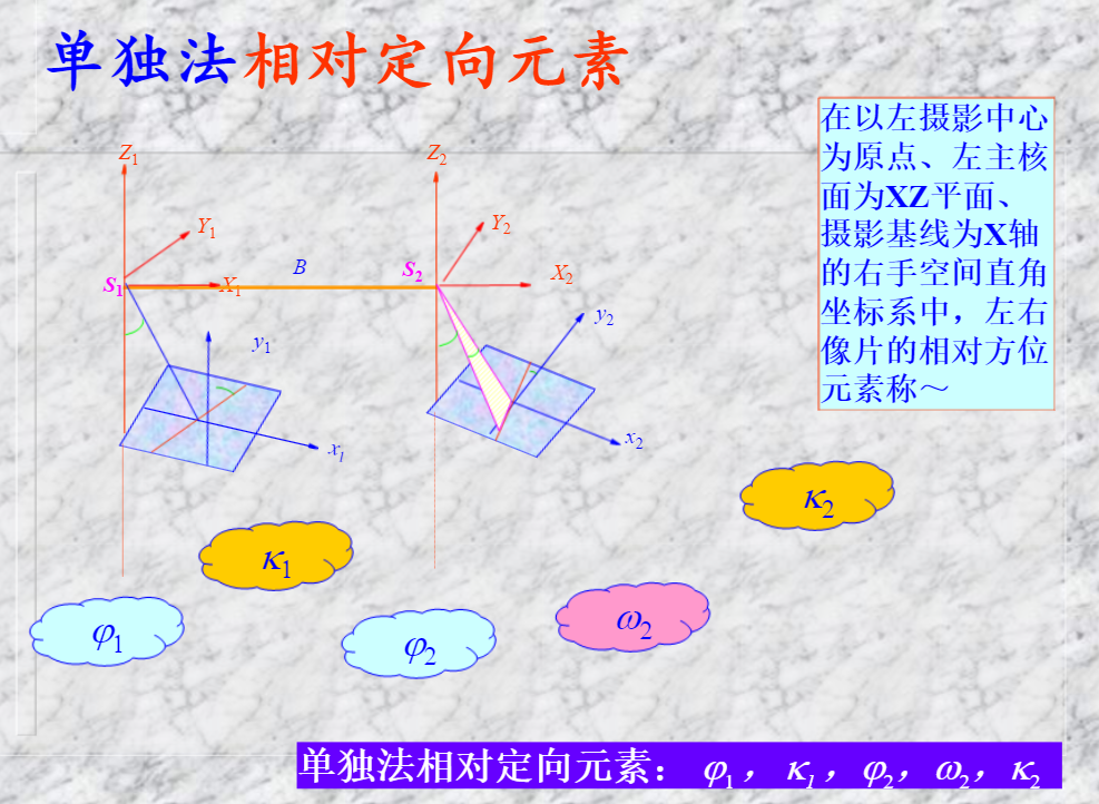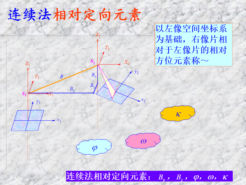 κ2为连续相对定向的五个相对定向元素,只要恢复了立体像对这五个元素,就确定了像片对的相对位置,完成了相对定向,可建立与地面相似的几何模型。