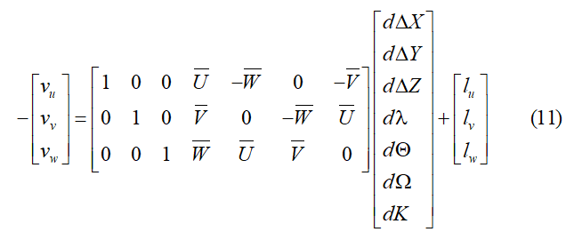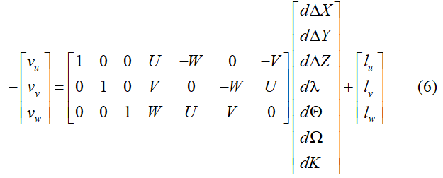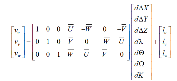 上式中含有七个未知数,需要列七个方程,因此,至少需要两个平高点和一个高程点,而且三个控制点不能在一条直线上。生产中,一般是在模型四个角布设四个控制点。当有多余观测时,应按最小二乘法解求,将上式中模型的像空间辅助坐标(U,V,W)视为观测值,其改正数为vu,vv,vw,写成误差方程形式,得: