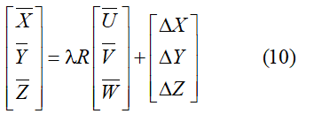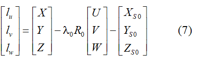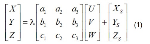 该式为绝对定向的基本关系式。由于这种变换前后图形的几何形状相似,所以又称为空间相似变换。式中,(X,Y,Z)为模型点的地面摄影测量坐标,(U,V,W)为同一模型点在像空间辅助坐标系的坐标。