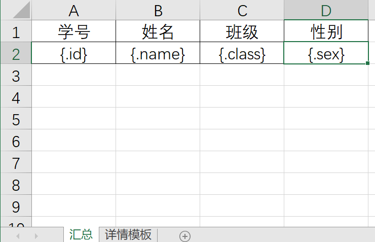 - 这是详情表,模板可以根据你想要的来,填充非对象集合就不需要加点,这里要记住你需要生成多sheet的模板索引,这里位置在第二个,索引就是1,后面编码过程会用到
