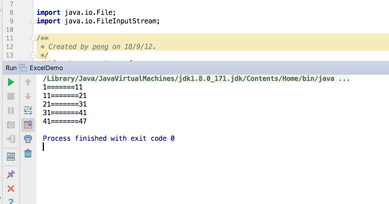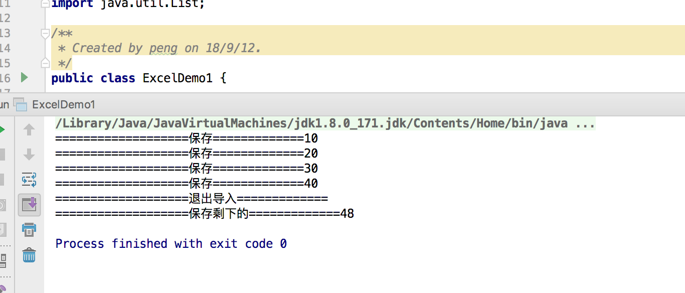 1 package oldboy; 2 3 import org.apache.poi.hssf.usermodel.HSSFWorkbook; 4 import org.apache.poi.ss.usermodel.Cell; 5 import org.apache.poi.ss.usermodel.Row; 6 import org.apache.poi.ss.usermodel.Sheet; 7 8 import java.io.File; 9 import java.io.FileInputStream; 10 11 /** 12 * Created by peng on 18/9/12. 13 */ 14 public class ExcelDemo { 15 16 public static int READ_INDEX = 10;//这里设置每次读取的行数 17 18 public static void main(String[] args) throws Exception { 19 testImport(); 20 } 21 22 public static void testImport() throws Exception { 23 boolean flag = true; 24 //cycleNum 循环读取次数 25 int cycleNum = read("/Users/peng/Desktop/20180912/111.xls", 0); 26 while (flag) { 27 if (cycleNum != 0) { 28 cycleNum = read("/Users/peng/Desktop/20180912/111.xls", cycleNum); 29 } else { 30 flag = false; 31 } 32 } 33 } 34 35 /** 36 * 读取Excel 37 * 38 * @param localPath 文件路径 39 * @param cycleNum 剩余的读取次数 40 * @return 41 * @throws Exception 42 */ 43 public static int read(String localPath, int cycleNum) throws Exception { 44 File file = new File(localPath); 45 FileInputStream inputStream = new FileInputStream(file); 46 HSSFWorkbook book = new HSSFWorkbook(inputStream); 47 Sheet sheet = book.getSheetAt(0); //sheet 从0开始 48 Row row = sheet.getRow(0); //获取第一行 49 int rowEndNum = getRow(); //取得最后一行的行号 50 //向上取整 51 int cycleIndex = (int) (Math.ceil((double) rowEndNum / (double) READ_INDEX)); 52 int cycleStartNum, cycleEndNum; 53 if (cycleNum == 0) {//第一次循环进来 54 cycleNum = cycleIndex; 55 cycleStartNum = 1; 56 if (rowEndNum > READ_INDEX) { 57 cycleEndNum = READ_INDEX + 1; 58 } else {//第一次循环如果最大行数小于设定的读取行数 59 cycleEndNum = rowEndNum; 60 } 61 } else { 62 if (cycleNum == 1) {//最后一次循环的时候 63 cycleStartNum = READ_INDEX * (cycleIndex - cycleNum) + 1; 64 cycleEndNum = rowEndNum; 65 } else { 66 cycleStartNum = READ_INDEX * (cycleIndex - cycleNum) + 1; 67 cycleEndNum = READ_INDEX + READ_INDEX * (cycleIndex - cycleNum) + 1; 68 } 69 } 70 cycleNum -= 1; 71 //每次循环的开始行数和结束行数 72 System.out.println(cycleStartNum + "=======" + cycleEndNum); 73 //System.out.println(rowEndNum); 74 for (int i = cycleStartNum; i < cycleEndNum; i++) {//跳过第一行从第二行开始循环 75 row = sheet.getRow(i); 76 for (int j = 0; j < row.getLastCellNum(); j++) {//列循环开始,从第0列开始 77 Cell cell = row.getCell(j); 78 //ExcelUtils.getCellValue获取单元格内容,这里忽略 79 String cellValue = ExcelUtils.getCellValue(cell); 80 //System.out.print(cellValue.concat(" | ")); 81 } 82 //System.out.println(); 83 } 84 //返回剩余循环次数 85 return cycleNum; 86 } 87 88 //这里获取Excel的真实行数 89 public static int getRow() { 90 return 47; 91 } 92 93 }