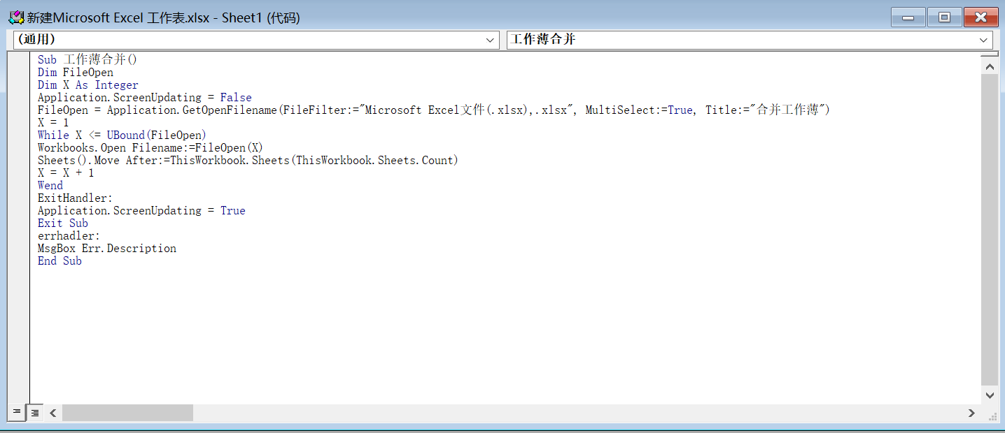 FileOpen = Application.GetOpenFilename(FileFilter:="Microsoft Excel文件(.xlsx),.xlsx", MultiSelect:=True, Title:="合并工作薄")