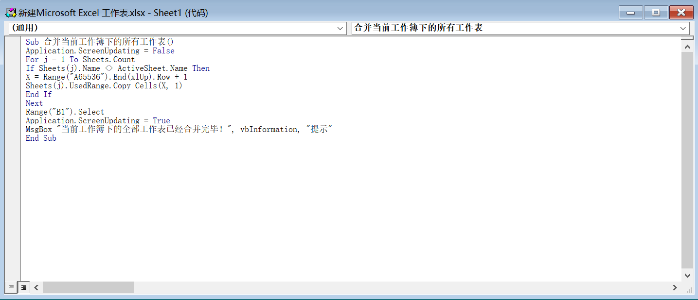 MsgBox "当前工作簿下的全部工作表已经合并完毕!", vbInformation, "提示"