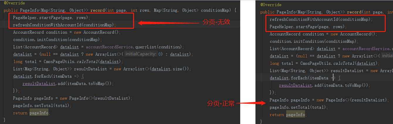 3)原因:refreshConditionWithAccountId中有Mapper查询,导致accountRecordService.queryList分页无效