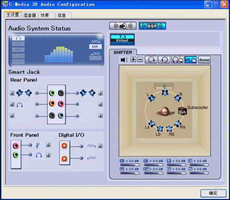 从上图的接口看远处的3.5mm标准音频接口就是输入端,分别有四个颜色:绿、橙、黑、灰。理论上四个接口如果都采用双声道设计,可以传输8个声道的信号。而我们知道5.1构架是基于6声道的设计(可以说没有完全利用),以上四色接口对应的声道定义为:绿(前置左右声道)、橙(单声道重低音 单声道人声)、黑(后置左右声道)、灰(两侧左右声道)。