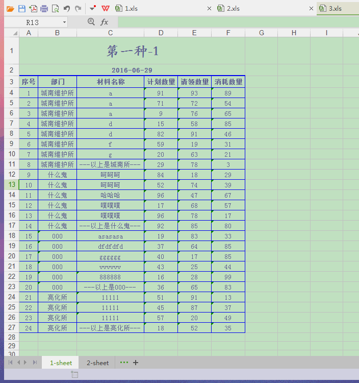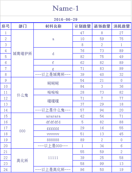 1 package com.centit.njld.commons.testexcel; 2 3 import java.util.ArrayList; 4 import java.util.LinkedHashMap; 5 import java.util.List; 6 import java.util.Random; 7 8 import com.centit.njld.commons.testexcel.TestExcel_Export.ExcelExportData; 9 10 public class TestExcel_Main { 11 12 private static List<TestExcel_Model> getData1() { 13 List<TestExcel_Model> data = new ArrayList<TestExcel_Model>(); 14 Random rand = new Random(); 15 data.add(new TestExcel_Model("城南维护所", "a", rand.nextInt(100),rand.nextInt(100),rand.nextInt(100))); 16 data.add(new TestExcel_Model("城南维护所", "a", rand.nextInt(100),rand.nextInt(100),rand.nextInt(100))); 17 data.add(new TestExcel_Model("城南维护所", "a", rand.nextInt(100),rand.nextInt(100),rand.nextInt(100))); 18 data.add(new TestExcel_Model("城南维护所", "d", rand.nextInt(100),rand.nextInt(100),rand.nextInt(100))); 19 data.add(new TestExcel_Model("城南维护所", "d", rand.nextInt(100),rand.nextInt(100),rand.nextInt(100))); 20 data.add(new TestExcel_Model("城南维护所", "f", rand.nextInt(100),rand.nextInt(100),rand.nextInt(100))); 21 data.add(new TestExcel_Model("城南维护所", "g", rand.nextInt(100),rand.nextInt(100),rand.nextInt(100))); 22 data.add(new TestExcel_Model("城南维护所", "---以上是城南所---", rand.nextInt(100),rand.nextInt(100),rand.nextInt(100))); 23 24 data.add(new TestExcel_Model("什么鬼", "呵呵呵", rand.nextInt(100),rand.nextInt(100),rand.nextInt(100))); 25 data.add(new TestExcel_Model("什么鬼", "呵呵呵", rand.nextInt(100),rand.nextInt(100),rand.nextInt(100))); 26 data.add(new TestExcel_Model("什么鬼", "哈哈哈", rand.nextInt(100),rand.nextInt(100),rand.nextInt(100))); 27 data.add(new TestExcel_Model("什么鬼", "噗噗噗", rand.nextInt(100),rand.nextInt(100),rand.nextInt(100))); 28 data.add(new TestExcel_Model("什么鬼", "噗噗噗", rand.nextInt(100),rand.nextInt(100),rand.nextInt(100))); 29 data.add(new TestExcel_Model("什么鬼", "---以上是什么鬼---", rand.nextInt(100),rand.nextInt(100),rand.nextInt(100))); 30 31 data.add(new TestExcel_Model("000", "asasasa", rand.nextInt(100),rand.nextInt(100),rand.nextInt(100))); 32 data.add(new TestExcel_Model("000", "dfdfdfd", rand.nextInt(100),rand.nextInt(100),rand.nextInt(100))); 33 data.add(new TestExcel_Model("000", "gggggg", rand.nextInt(100),rand.nextInt(100),rand.nextInt(100))); 34 data.add(new TestExcel_Model("000", "vvvvvv", rand.nextInt(100),rand.nextInt(100),rand.nextInt(100))); 35 data.add(new TestExcel_Model("000", "888888", rand.nextInt(100),rand.nextInt(100),rand.nextInt(100))); 36 data.add(new TestExcel_Model("000", "---以上是000---", rand.nextInt(100),rand.nextInt(100),rand.nextInt(100))); 37 38 data.add(new TestExcel_Model("亮化所", "11111", rand.nextInt(100),rand.nextInt(100),rand.nextInt(100))); 39 data.add(new TestExcel_Model("亮化所", "11111", rand.nextInt(100),rand.nextInt(100),rand.nextInt(100))); 40 data.add(new TestExcel_Model("亮化所", "11111", rand.nextInt(100),rand.nextInt(100),rand.nextInt(100))); 41 data.add(new TestExcel_Model("亮化所", "---以上是亮化所---", rand.nextInt(100),rand.nextInt(100),rand.nextInt(100))); 42 43 return data; 44 } 45 46 private static List<TestExcel_Model> getData2() { 47 List<TestExcel_Model> data = new ArrayList<TestExcel_Model>(); 48 Random rand = new Random(); 49 data.add(new TestExcel_Model("城南维护所", "111111", rand.nextInt(100),rand.nextInt(100),rand.nextInt(100))); 50 data.add(new TestExcel_Model("城南维护所", "111111", rand.nextInt(100),rand.nextInt(100),rand.nextInt(100))); 51 data.add(new TestExcel_Model("城南维护所", "333333", rand.nextInt(100),rand.nextInt(100),rand.nextInt(100))); 52 data.add(new TestExcel_Model("城南维护所", "---以上是城南--",rand.nextInt(100),rand.nextInt(100),rand.nextInt(100))); 53 54 data.add(new TestExcel_Model("亮化所", "---以上是亮化--", rand.nextInt(100),rand.nextInt(100),rand.nextInt(100))); 55 data.add(new TestExcel_Model("亮化所", "150W", rand.nextInt(100),rand.nextInt(100),rand.nextInt(100))); 56 data.add(new TestExcel_Model("亮化所", "22.2W", rand.nextInt(100),rand.nextInt(100),rand.nextInt(100))); 57 data.add(new TestExcel_Model("亮化所", "95W", rand.nextInt(100),rand.nextInt(100),rand.nextInt(100))); 58 data.add(new TestExcel_Model("亮化所", "95W", rand.nextInt(100),rand.nextInt(100),rand.nextInt(100))); 59 return data; 60 } 61 62 public static void main(String[] args) throws Exception { 63 List<String[]> columNames = new ArrayList<String[]>(); 64 columNames.add(new String[] { "部门", "材料名称","计划数量","请领数量","消耗数量" }); 65 columNames.add(new String[] { "部门", "材料名称","计划数量","请领数量","消耗数量" }); 66 List<String[]> fieldNames = new ArrayList<String[]>(); 67 fieldNames.add(new String[] { "unit", "mtName","jhsl","qlsl","xhsl" }); 68 fieldNames.add(new String[] { "unit", "mtName","jhsl","qlsl","xhsl" }); 69 List<String[]> groupNames = new ArrayList<String[]>(); 70 groupNames.add(new String[] { "unit", "mtName" }); 71 groupNames.add(new String[] { "unit", "mtName" }); 72 73 LinkedHashMap<String, List<?>> dataMap = new LinkedHashMap<String, List<?>>(); 74 dataMap.put("1-sheet", getData1()); 75 dataMap.put("2-sheet", getData2()); 76 77 ExcelExportData setInfo = new ExcelExportData(); 78 setInfo.setDataMap(dataMap); 79 setInfo.setFieldNames(fieldNames); 80 setInfo.setTitles(new String[] { "Name-1", "Name-2" }); 81 setInfo.setGroupColumn(groupNames); 82 setInfo.setColumnNames(columNames); 83 84 System.out.println(TestExcel_Export.export2File(setInfo, "D:/ywwwwwwwwwwwwwwwww.xls")); 85 } 86 87 }