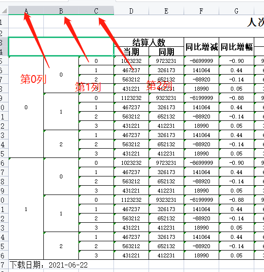 columns:是需要合并的列数,0,1:合并第0 列和第1列