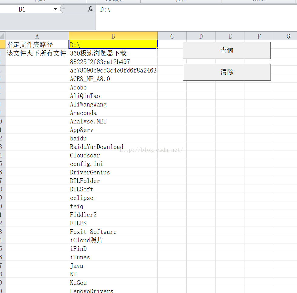 高亮的单元格用以输入目标文件夹的路径,如 C: , D:MySQL 等等。点击“查询”,则会将指定路径下所有的文件或者子文件夹的名字打印出来;清楚则会将该表的内容清除,但是以上高亮单元格内的内容将被保留。