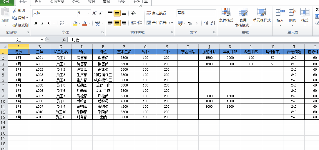 选中表格中A1单元格,依次单击 开发工具→录制宏 命令,这时候就会弹出录制宏对话框;