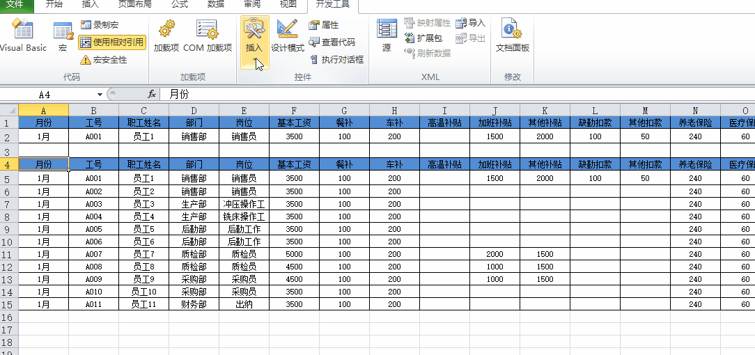 在第二条工资信息前插入两行空行;