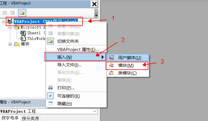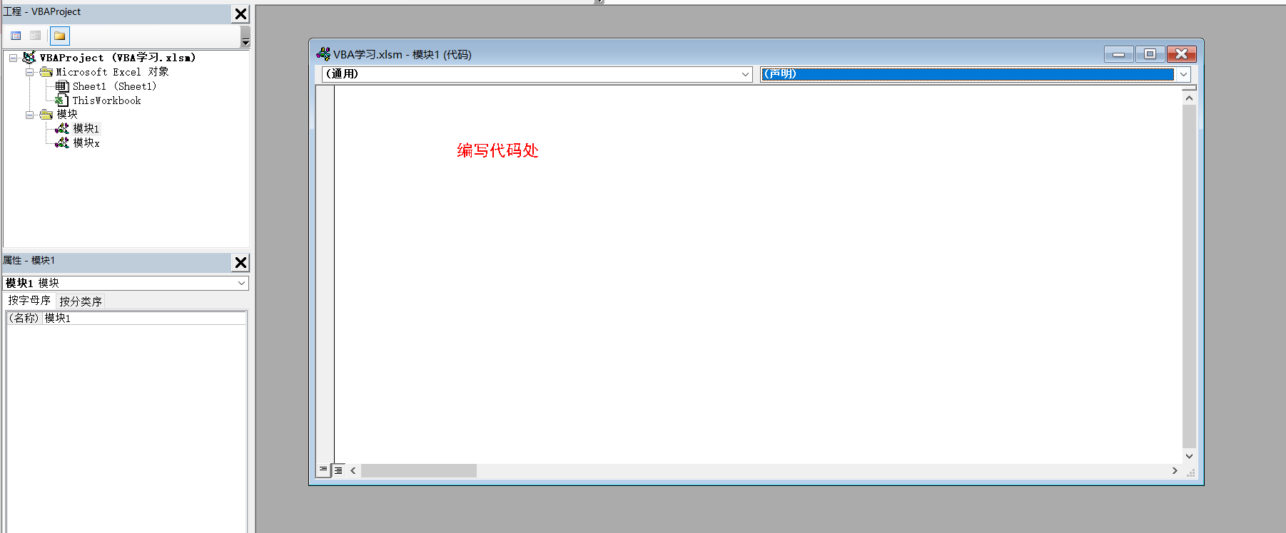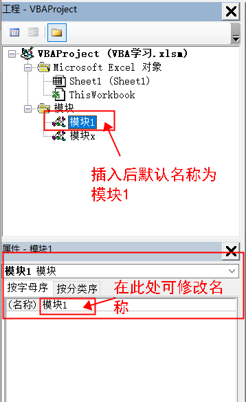 每一个xlsm文件都是一个VBA工程,编码可以在Sheet1中编写,也可以自己创建模块编写
