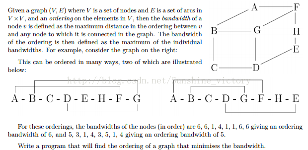 题意:给出一个n(n<=8)个结点的图G和一个结点的排列,定义结点 i 的宽带b(i)为 i 和相邻结点在排列中的最远距离,而所有b(i)的最大值就是整个图的G,一个图有很多排列,求出让带宽最小的结点排列。