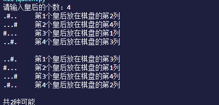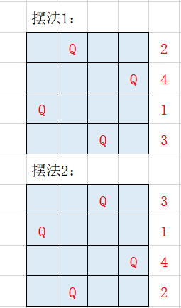 - 4皇后的2种摆法(一种颜色表示一种摆法):
