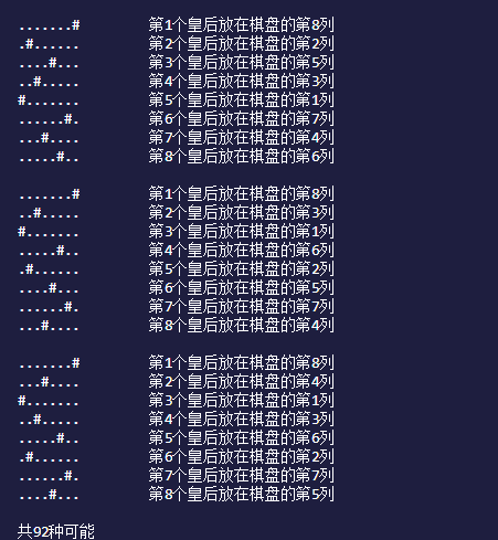 print(a,"t","第{}个皇后放在棋盘的第{}列".format(j+1,i[j]))