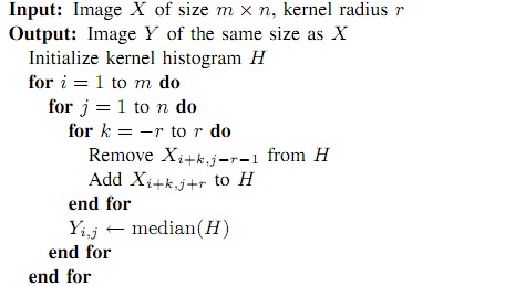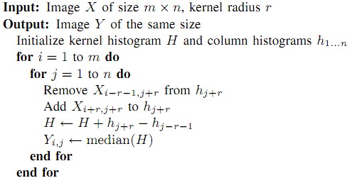 为了实现该功能,我们需要为每个开辟一个记录其最后被更新的位置的列表。当从一个像素移向下个一个像素时,我们更新列直方图以及核直方图的粗分数据。然后根据粗分数据计算出中值再细分数据中所在的段。下一步,根据这个段上次被更新的位置更新的细分直方图。如果上次更新的位置和当前列的位置相差2r+1的距离,那说明旧的位置和当前位置没有任何交叉。因此我们从0开始更新段。正是通过这种方式,我们加速了整个处理速度。