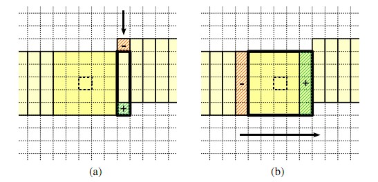 图 2 算法的两步执行 (a)右侧的列直方图的更新通过减最上部和加最下部像素信息获得