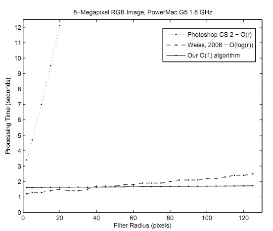 现代处理器提供了SIMD指令可以用来加速我们的算法。上面描述的操作大部分都是对直方图数据进行加和减操作。通过MMX,SSE2或Altivec指令可以并行处理多个直方图操作。为了在一条指令中做更多的直方图处理,直方图的只能用16位的数据类型。因此,核心的大小最大为216(对应的核的大小是(256/2-1)),对于一般的应用足够了。这个限制并不只是对我们的算法:这是一种优化的手段而已。
