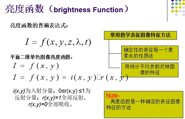 - 数字图像:图像可定义为一个二维函数f(x,y),幅值f为图像的强度(灰度)。当x,y,f是有限的离散数值时,该图像为数字图像。