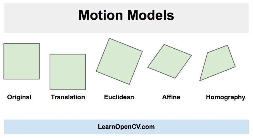 正如你在上面的图片中看到的,在欧几里得运动模型中,图像中的一个正方形可以转换为任何其他位置、大小或旋转不同的正方形。它比仿射变换和单应变换限制更严格,但对于运动稳定来说足够了,因为摄像机在视频连续帧之间的运动通常很小。