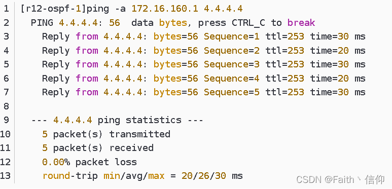 [r12-ospf-1-area-0.0.0.2]ping -a 172.16.160.1 4.4.4.4