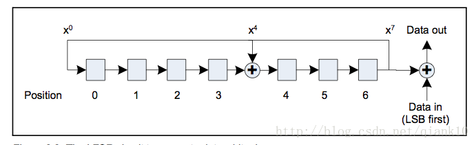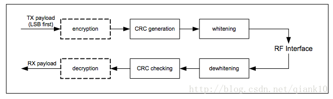data whitening 是在生成crc之后进行的,其作用对象是pdu和crc。data whitening的过程与生成crc的过程相似,也是使用特定的反馈移位寄存器,而区别则是两者的目的不同,data whitening使用最高位输出的伪随机码与数据比特进行模2和,对原始数据进行扰码。data whitening的示意图如下:
