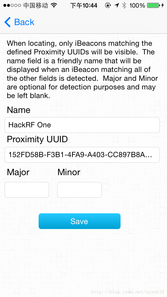 这次我们用iphone接收信号,app store中的Locate应用可以接收附近ibeacon广播的信号。不过只有在该应用中声明了uuid的ibeacon才能被该应用探测到,因此我们需要在应用中新建一个ibeacon的profile,如下图所示: