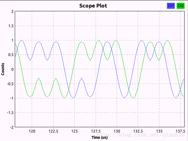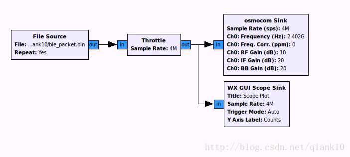 其中file source模块从ibeacon信号文件中读取数据,并将其传入osmocom sink模块,osmocom sink模块通过驱动与hackrf one通信,将接收到的数据传输给hackrf one,并由后者调制到载波并发射。右下的scope sink用于显示gsfk调制信号的波形。