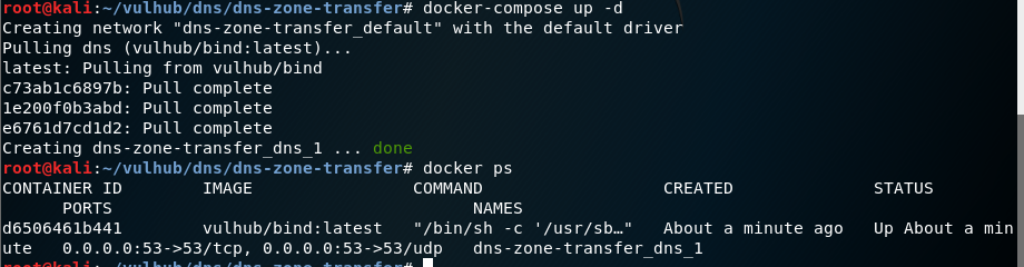 cd /vulhub/dns/dns-zone-transfer //切换到具体类型的靶场目录