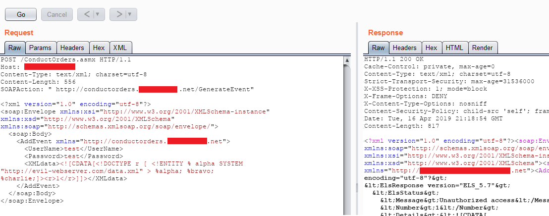 在这种情况下,各种 API 方法都有可能包含注入的 ENTITY 标记的<XMLData>部分。因此,向/ConductOrders.asmx端点发出以下 POST 请求会向攻击者的 Web 服务器生成请求: