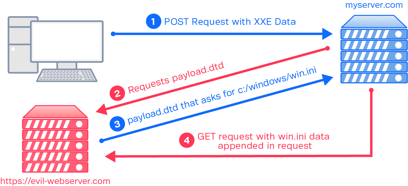 - 服务器从https://evil-webserver.com请求payload.dtd