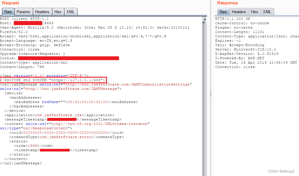 与许多漏洞一样,当您开始将 XXE 与其他漏洞链接起来时,它会变得更加有趣。XXE 获得本地文件披露 (LFD) 作为 PoC 很有用,但真正的攻击者可能希望使用 XXE 做更多的事情,而不仅仅是读取本地文件(特别是因为这种攻击受到 Web 服务器权限的限制)。由于 XXE 指示服务器代表它执行某些操作,因此攻击者可以使用它来映射内部主机和/或端口,方法是使用 XML 解析器执行服务器端请求伪造 (SSRF)。这样的 XXE + SSRF 提交去年遇到了我们的队列。此特定漏洞被用于 JAMF 软件,该软件具有基于 XML 的协议,如 SOAP,使其可能易受 XXE 攻击。