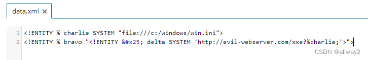 此 XML 代码将指示 XML 解析器将请求中本地c:windowswin.ini文件的内容发送到攻击者服务器,所有这一切都通过将 charlie 变量附加到请求的末尾,使其在攻击者的服务器日志: