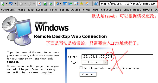 提醒一个容易出问题的地方,因为在改变Default.htm文件的时候已经改变了RDP的端口,在使用Web方式访问的时候,就没有必要再输端口号,我一开始也搞错了,呵呵,如图。