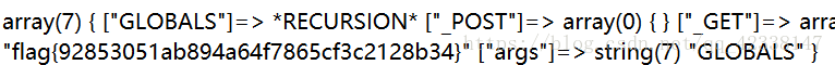 如果GET传入值匹配不对就报错,否则就执行var_dump($$args);由此传入args=args,发现并没有flag出现,传入超全局变量GLOBALS,打印全局作用域中可用的全部变量,flag自然也就出来了。