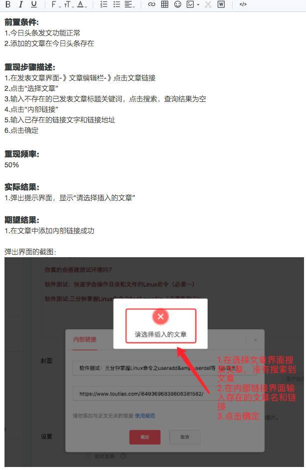 前置条件: 1.今日头条发文功能正常 2.添加的文章在今日头条存在 重现步骤描述: 1.在发表文章界面-》文章编辑栏-》点击文章链接 2.点击“选择文章” 3.输入不存在的已发表文章标题关键词,点击搜索,查询结果为空 4.点击“内部链接” 5.输入已存在的链接文字和链接地址 6.点击确定 重现频率: 50% 实际结果: 1.弹出提示界面,显示“请选择插入的文章” 期望结果: 1.在文章中添加内部链接成功