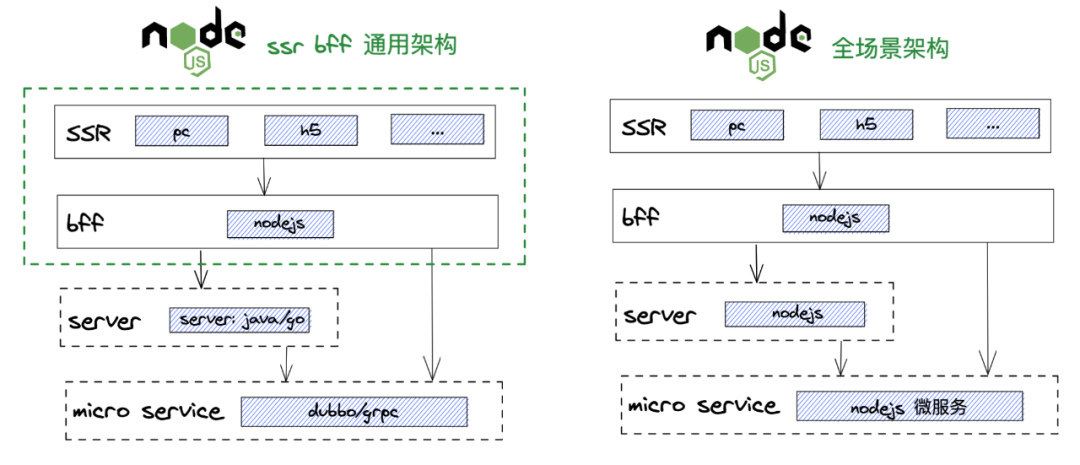 全场景架构:包含 ssr、bff、服务器、微服务。