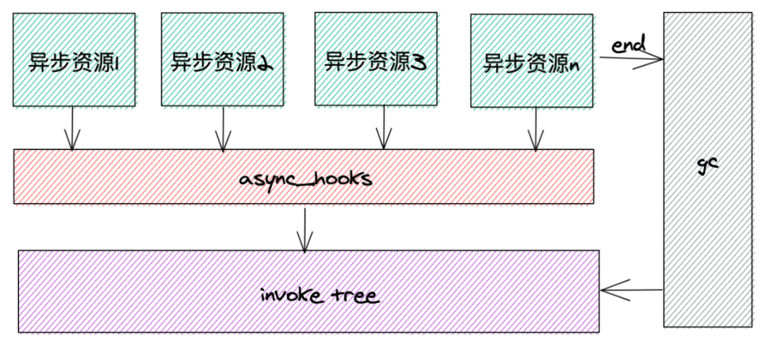 核心逻辑如下:异步资源(调用)创建后,会被 async_hooks 监听到。监听到后,对获取到的异步资源信息进行处理加工,整合成需要的数据结构,整合后,将数据存储到 invoke tree 中。在异步资源结束时,触发 gc 操作,对 invoke tree 中不再有用的数据进行删除回收。