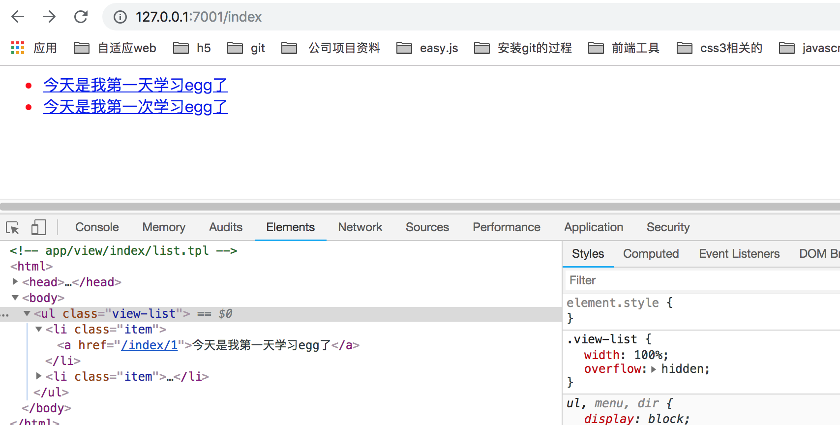 <!-- app/view/index/list.tpl --> <html> <head> <title>第一天学习egg</title> <link rel="stylesheet" href="/public/css/index.css" /> </head> <body> <ul class="view-list"> {% for item in list %} <li class="item"> <a href = "{{ item.url }}">{{ item.title }}</a> </li> {% endfor %} </ul> </body> </html>