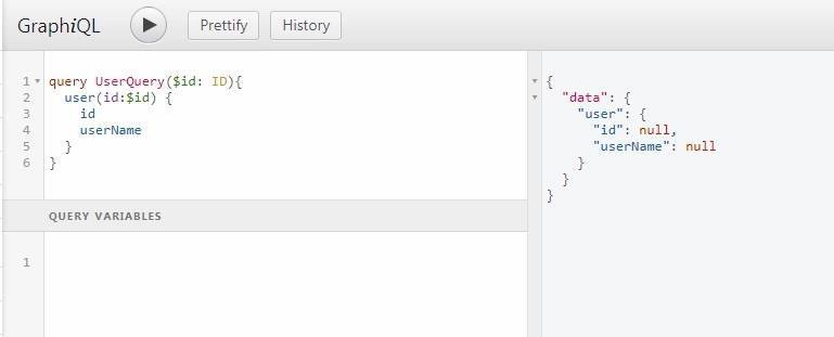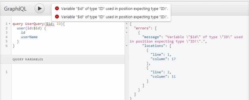 上面的代码只是定义了一个输入属性id,并未定义其是否是必填,所以当查询时,如果没有配置查询id,查询不会报错,只会获取一个为null的空值结果。但是讲道理的话,我们希望这是一个必填项,所以我们需要修改服务端的代码,将id: { type: GraphQLID } 更换为id: {type: new GraphQLNonNull(GraphQLID)},这句代码的含义就表示id是一个类型为ID的必填项,再次执行我们的查询可以得到下面的错误提示,提示id是一个必填的ID类型,同时右侧也没有获取到为空的查询结果.