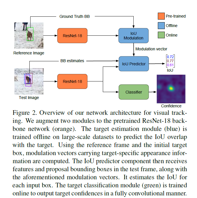 文章提出了一个新的跟踪架构,包括专门的目标估计和分类部分。通过广泛的离线学习,高水平的知识被融合进目标估计中。目标估计部分被训练来预测目标和一个估计的bbox之间的重叠。通过仔细地整合特定目标信息,该方法达到了一个非常高的回归框精度。之后的分类部分被在线训练保证在干扰物存在的情况下的高分辨能力。