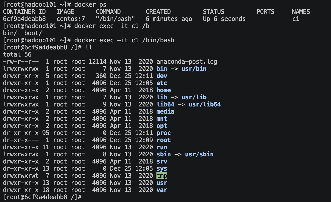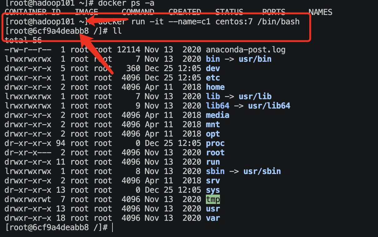 docker run -it --name=c1 centos:7 /bin/bash