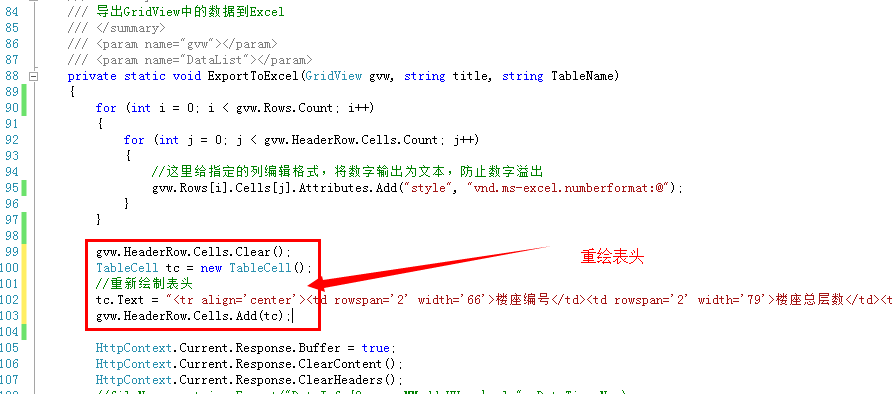 1 gvw.HeaderRow.Cells.Clear(); 2 TableCell tc = new TableCell(); 3 //重新绘制表头 4 tc.Text = "<tr> ...... </tr>"; 5 gvw.HeaderRow.Cells.Add(tc);
