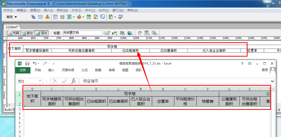 我使用Office Excel 2013 绘画好表头,然后直接复制,在Macromedia Dreamweaver 8的设计面板粘贴就可以贴上去了,然后转到代码页面就可以快速得到table代码。