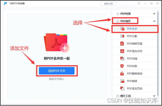 ① 首先,我们在页面中展开【PDF操作】,第一个就是PDF合并,我们选中后,将PDF文件添加进来。