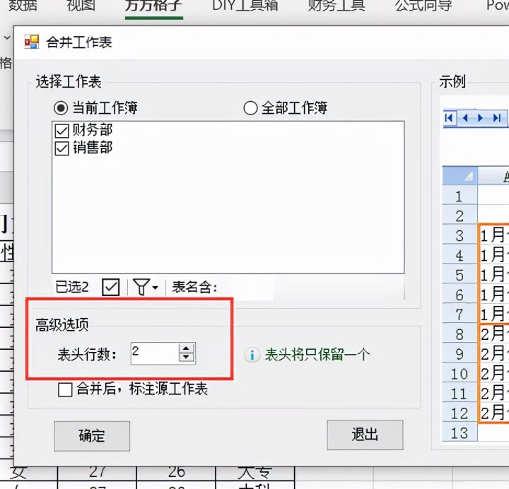 5.在高级选项中将表头行数设置为2