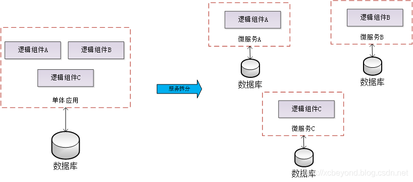 服务的拆分,不单单指功能的拆分,如上图所示,还得考虑数据库的拆分 ,确保降低功能逻辑层、数据访问层的耦合度。
