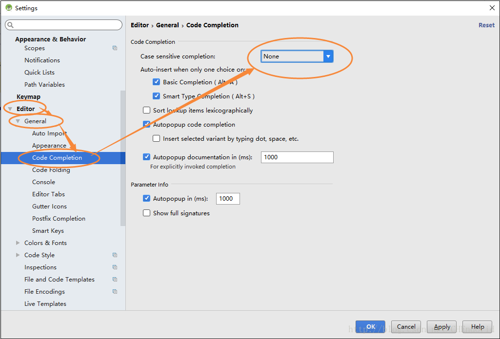 依次选择 Editor --> General --> Code Completion ,将 Case sensitive completion 选为 None