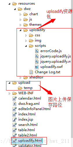 本例是把dwz中整合uploadify功能抽取出来的,可以进行单独使用,不一定要遭dwz中才能使用,本例只是为了测试,所以使用静态页面进行测试: