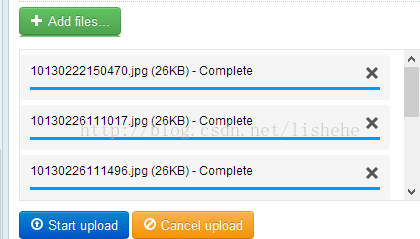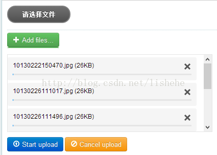 这种效果来说,还是不错的,非常多内容它给封装到了框架里面,对于多文件上传,每个文件会调用后台的action方法,这个也是其和Struts2的完美组合吧,细心+文档=实现,这部分内容还是须要我们多多的实战,对于框架而言要多用学习到的很多其它,收获更大.