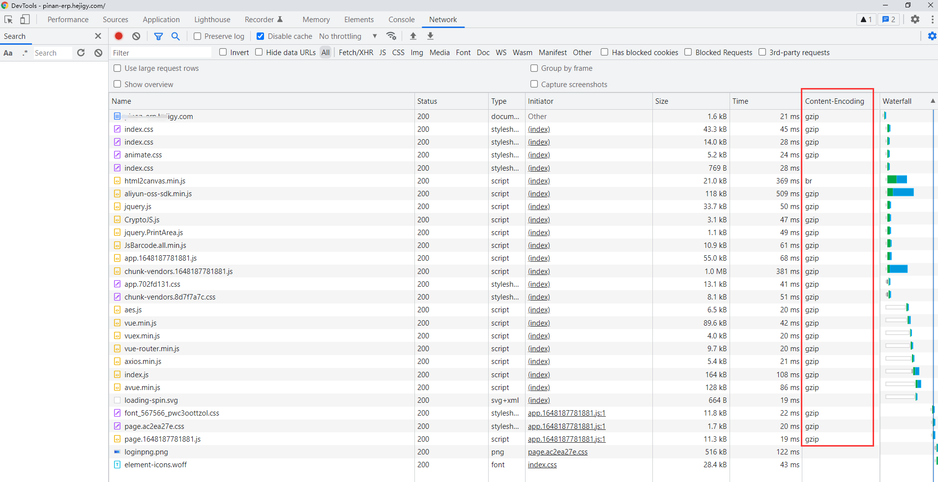 6.配置完了之后我们可以把我们打好包的进行发版操作,然后通过游览器的控制台看看是否已经好了,如果显示content-Encoding如下图所示就说明,就说可以了,这时我们发现第一次运行速度果然变快了